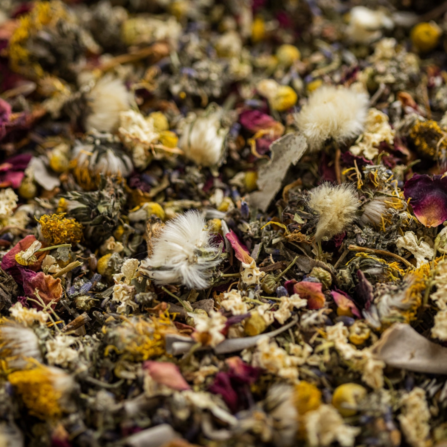 Róża stulistna, Niepokalanek, Mniszek lekarski, Bylica pospolita, Kalina koralowa, Oczar Wirginijski, Rumianek pospolity, Lawenda wąskolistna, liść Mięty, Biała Szałwia..